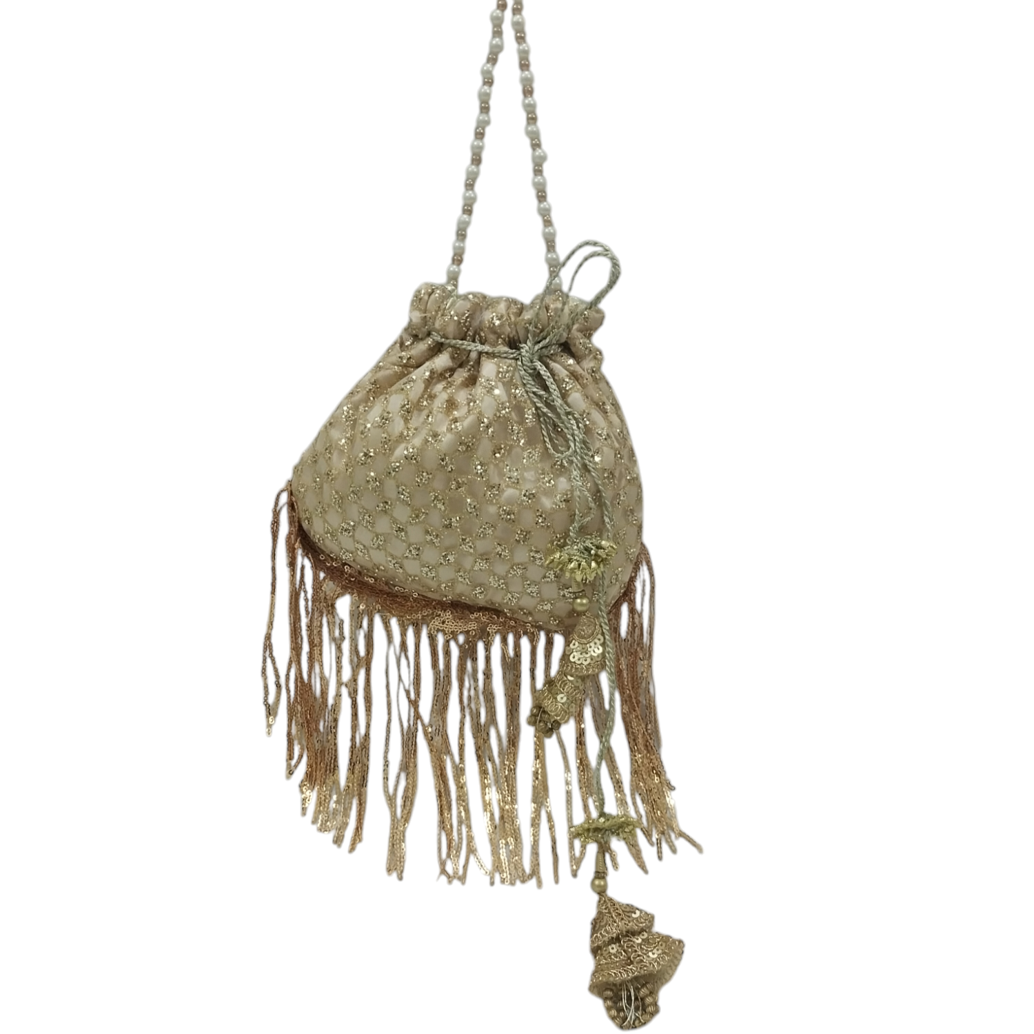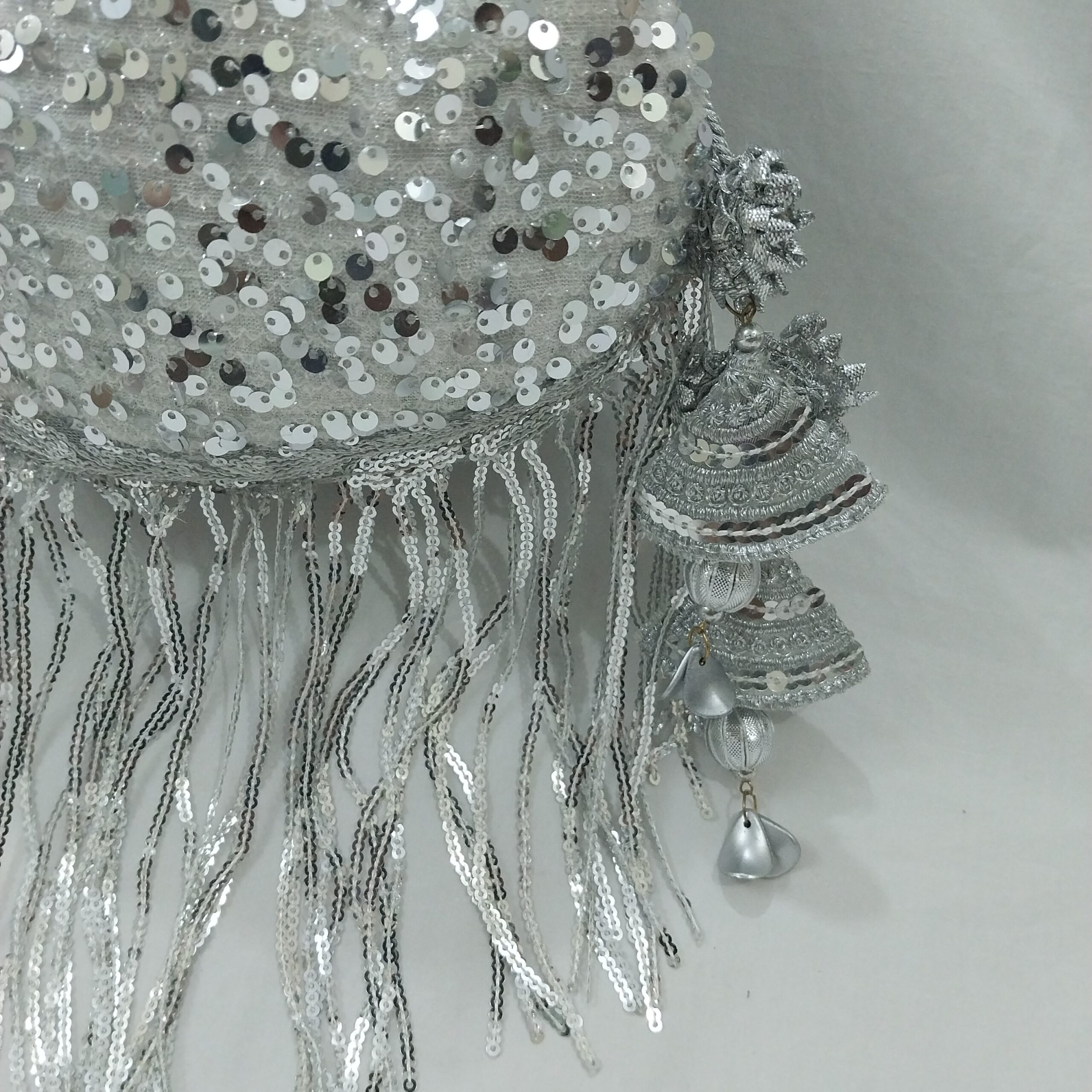 This bag is made of high quality embroidered sequins fabric with inner brocade golden lining. embroidered fabric is looking excellent and handmade tassels are carefully made to match the bag. This bag is made in a unique different shape for our customers who like to collect some unique and uncommon accessories. There are fringes with sequins at bottom which gives it a stylish look.  This is a highly recommended product for newly wed girls.